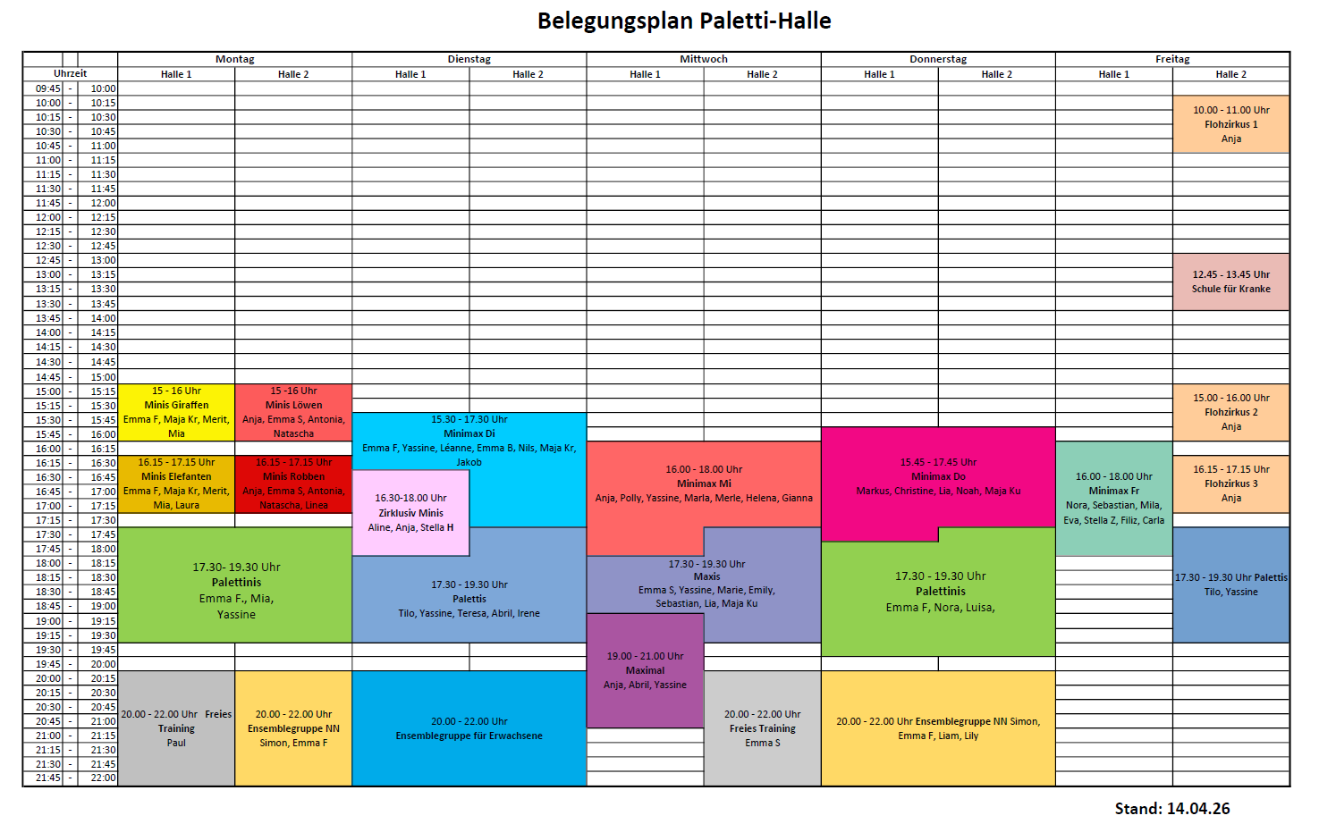Regelmäßige Fortbildungen aus dem pädagogischen, künstlerischen und sportlichen Bereich sowie regelmäßige Erste-Hilfe-Ausbildungen, regelmäßige Teambesprechungen und ein hoher Betreuerschlüssel stellen die Qualität des Trainings sicher.Eine Übersicht, welche TrainerInnen wann und in welcher Gruppe Training geben finden Sie hier:
